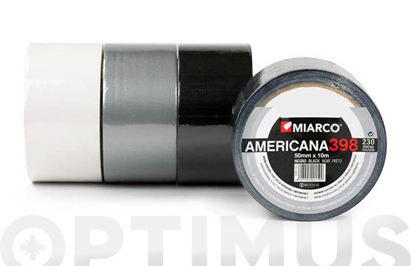 La cinta americana 398 de MIARCO és una cinta adhesiva de tela recoberta de polietilè amb adhesiu blanc de cautxú natural. Rotlle de 50 mm x 10 m. Color plata. Aquesta és una cinta adhesiva duradora i adaptable a qualsevol tipus de superfície, amb una bona resistència i adhesió, tant en interior com en exterior. Alt poder adherent. Resistent a altes temperatures. Resistent a l'aigua.
