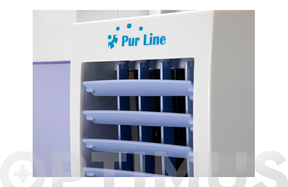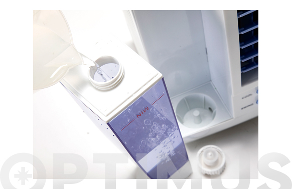 Climatització per humidificació de lambient. Consum: 60 W. Cabal: 200m3/h. Panell evaporatiu de cel·lulosa. Capacitat del depòsit: 1 litre. 3 velocitat. Oscil·lació automàtica de les lamel·les. Compacte i portàtil, amb nansa de transport.