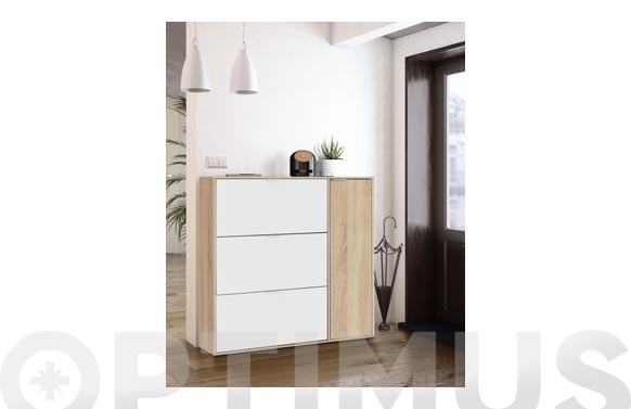 Moble sabater de 2 portes i 6 baldes per uns 24 parells de capacitat (aprox.). Tauler de partícules melaminitzat acabat en Roure Canadian. Dimensions: 108 x 55 x 36 cm.