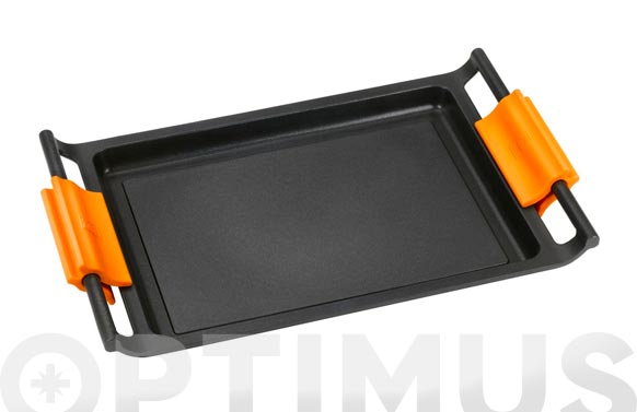 Planxa rectangular grill llisa EFFICIENT fabricada en alumini fos amb gran resistència a la deformació. Revestiment antiadherent interior i exterior TEFLON® PLATINUM PLUS de la més alta qualitat i lliure de PFOA. Apta per a tot tipus d'encimeres de cuina, incloses les d'inducció. Apta per netejar al rentaplats. Construïda en una sola peça. Apta per al forn. Gruix a la base 6 mm.