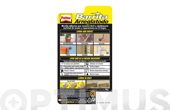 Masilla Epoxi Reactiva "Arreglatodo". No contiene disolventes. Fácil de amasar y aplicar. Rápida. Alta resistencia. Máxima dureza. Pega, rellena y sella.